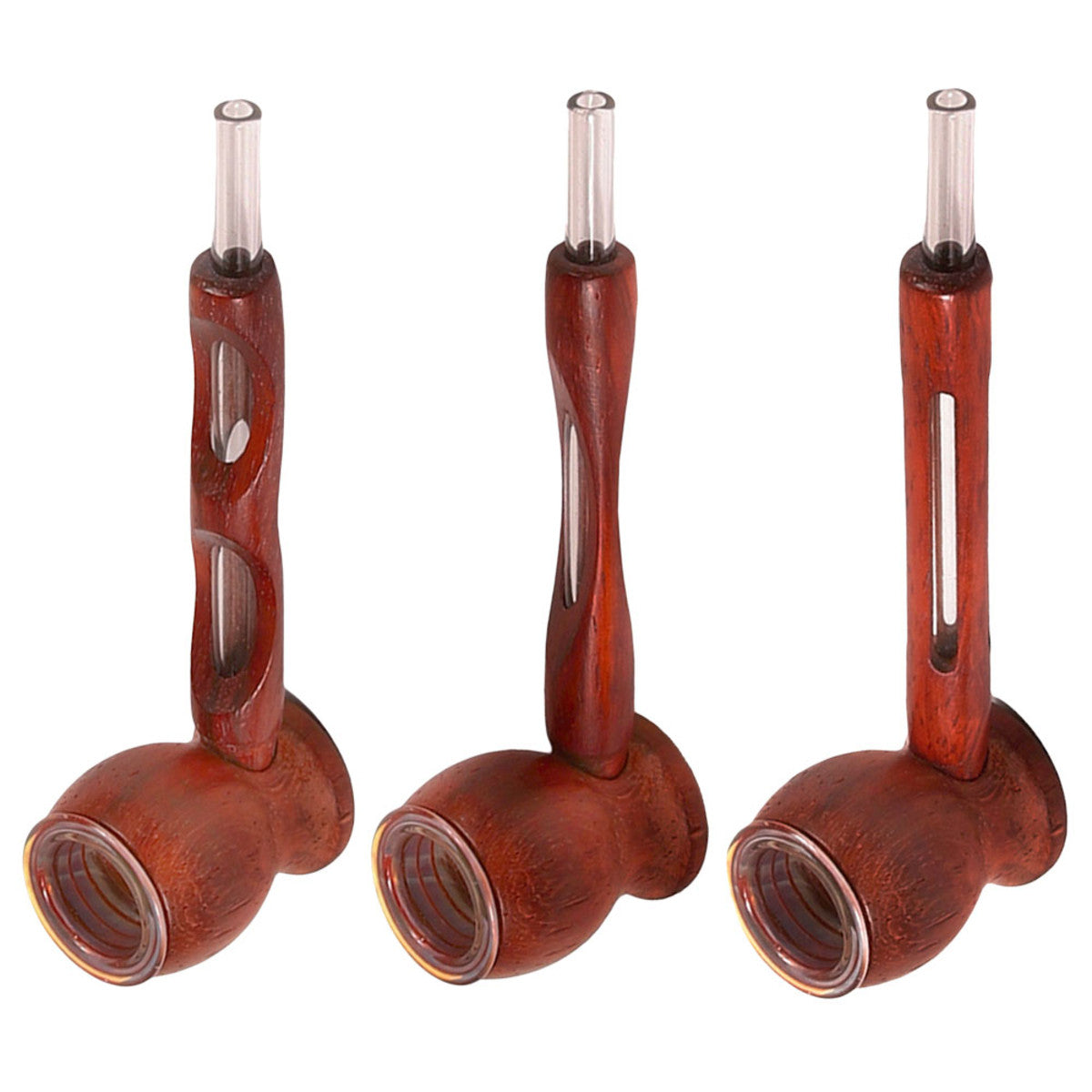 These hybrid wood and glass hand pipes measure 4.75 inches long. A wooden encasement protects the inner glass clear tubing of these unique spoon style pipes. Various wood cut designs.
