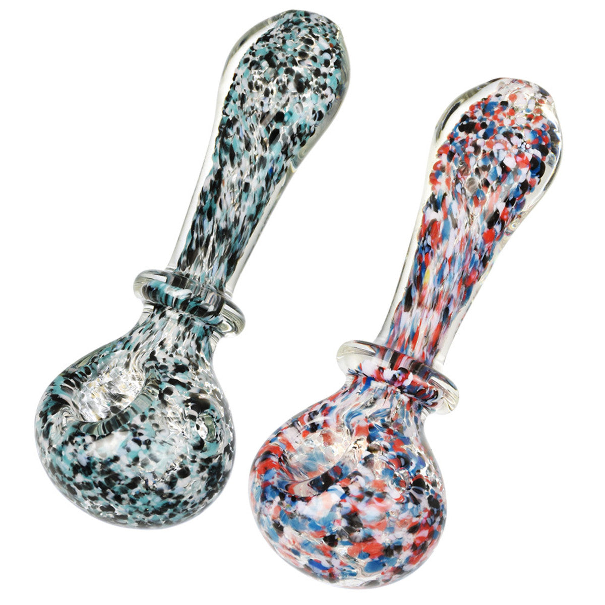 These spoon style pipes measure 4.75 inches long. Made from quality borosilicate glass, the pipes feature an asteroid field fritted design and a single-ringed neck. Colors vary.
