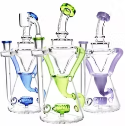 The Pulsar Elegance Gravity Fed recycler measures 9.5 inches tall and has a 14mm female slide joint. Its majestic V shape is accented by coloured tubes and funnels while its almost conical base keeps it steadily grounded.