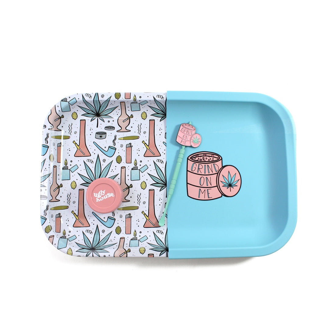 Introducing our new dabbing kits! This 4-Piece Dabbing Kit consists of a silicone rolling tray, which is a metal rolling tray with a removable food-grade silicone, and matching silicone dab container and dab tool!